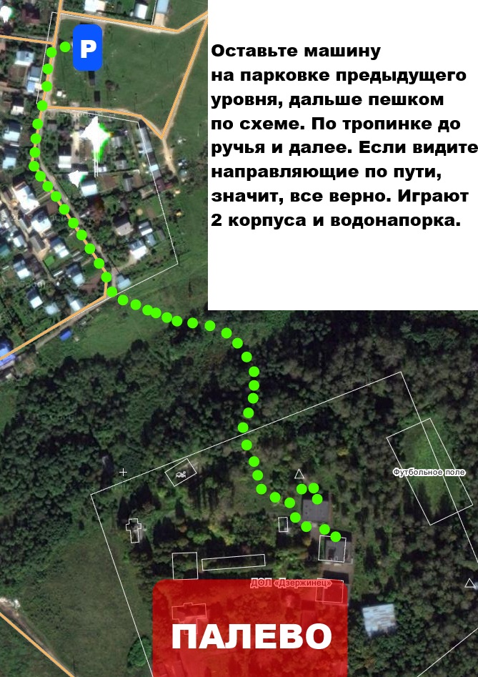 Примечания: доезжайте до парковки по координатам 55.672618 36.873947. Парковка вдоль дороги до шлагбаума. Далее по схеме, следуйте по направляющим. Вас ждут агенты в центральной части. Игра началась. Этот уровень заглушка на доезд и добег до локации. Не разбегайтесь по территории до начала уровня и слушайтесь агентов. На уровне вам понадобятся костюм горничной (закрепите на нём полученный доп) и конверт Приглашение. Также может пригодиться ручка и блокнот. |