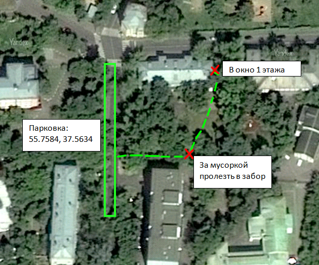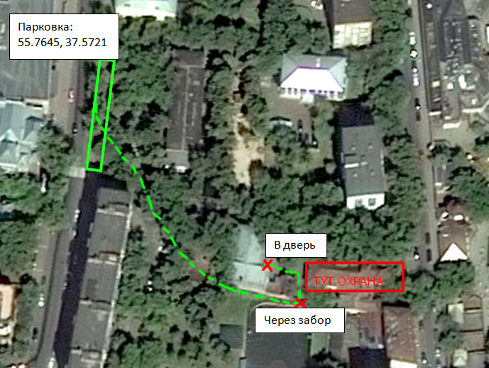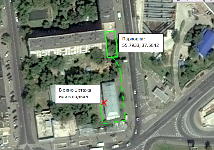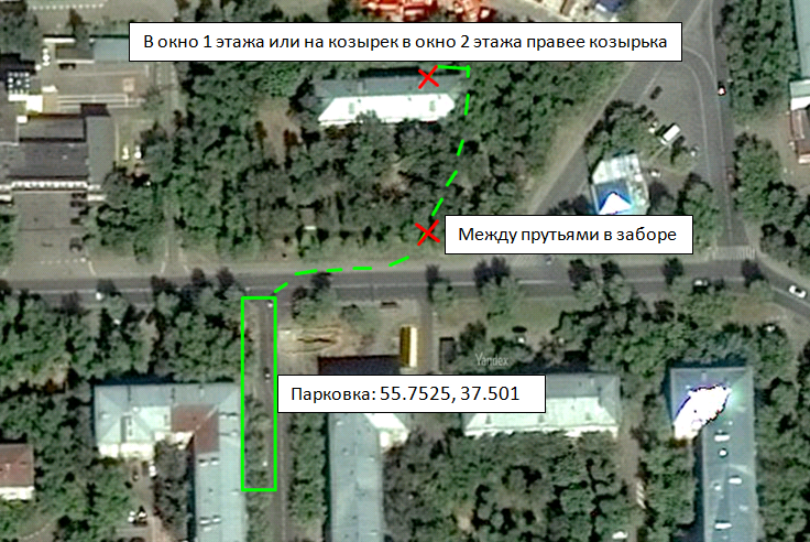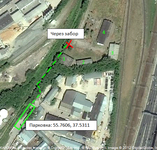 Парковка: 55.7606, 37.5311 Локация: 55.7618,37.5331 Парковаться до проходной не мешая проезду, ездят грузовики. От парковки прямо и налево на лесенку на жд пути, далее по путям. Схема Код оранжевым баллоном с обратной стороны забора в месте перелаза.