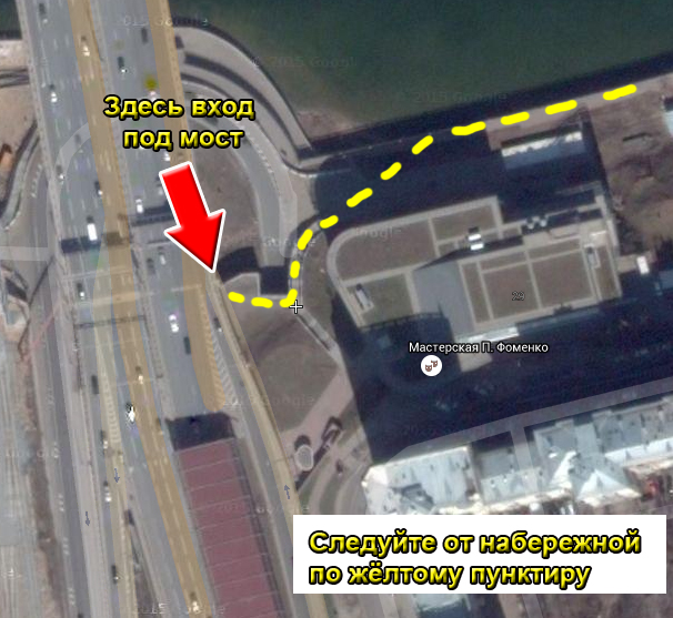 Судя по всему следующие послания агента необходимо искать на месте его наблюдательного пункта - внутри моста. Следуйте по схеме и смотрите под ноги. Примечание: от набережной поднимитесь по лесенке не до конца и пройдите под мост. Там открыта дверь. Зайдите внутрь и найдите 6 жёлтых треугольников в жёлтом круге - это метки. Послания агента находятся рядом с метками и представляют из себя набор букв, которые написаны синим цветом. Перед набором букв стоят 2 буквы "КИ" и двоеточие. Рядом с одной из меток написан ключ - это слово и 3 цифры. Введите эти 3 цифры и получите таблицу расшифровки посланий агента. ФО: слово