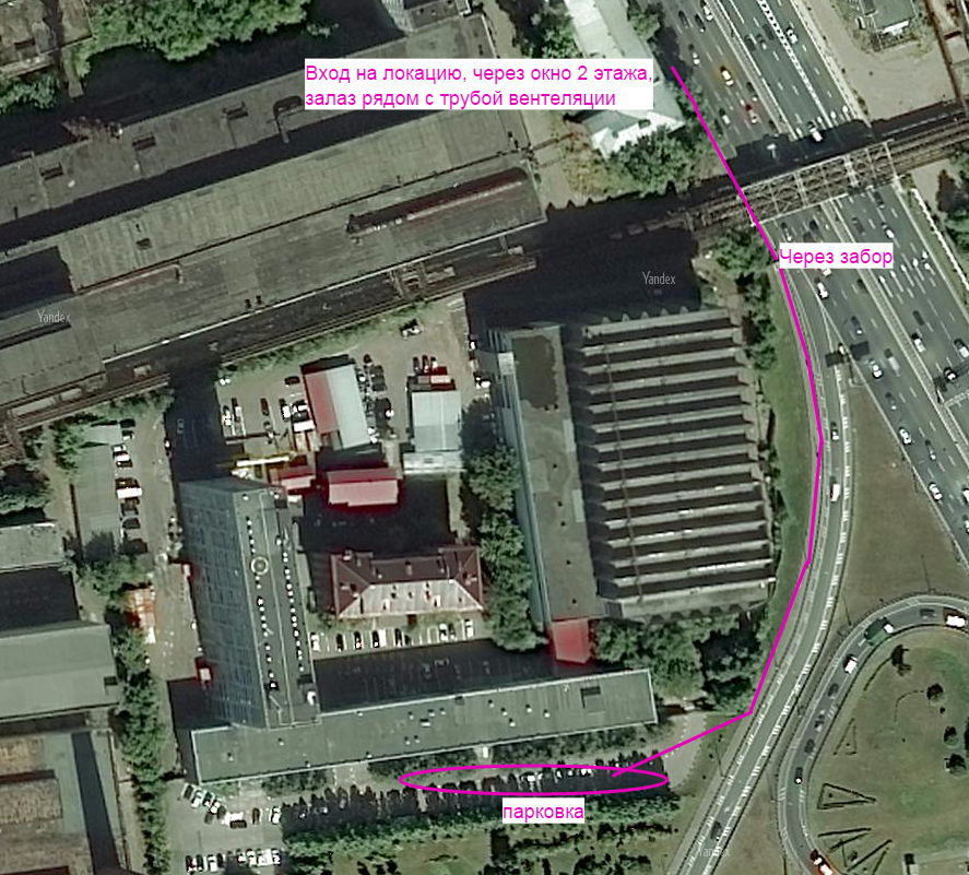 Координаты парковки: 55.748521 37.695861 Координаты локации: 55.750512 37.696516 Примечание: После парковки идти шагом не привлекая внимания, фонари до локации не включать, не разговаривать и не дышать. Перелезать через забор на углу, далее по тропинке краем ТТК до цеха, залаз по трубе вентиляции в окно 2 этажа. Внутри цеха перемещаться строго по направляющим, в окна не светить.