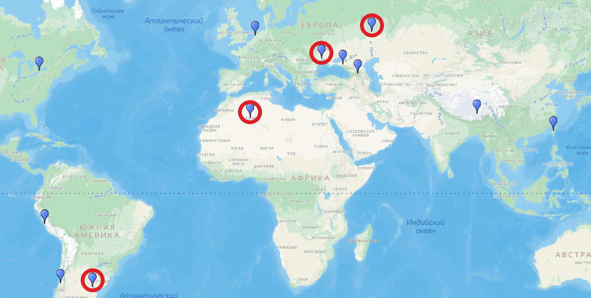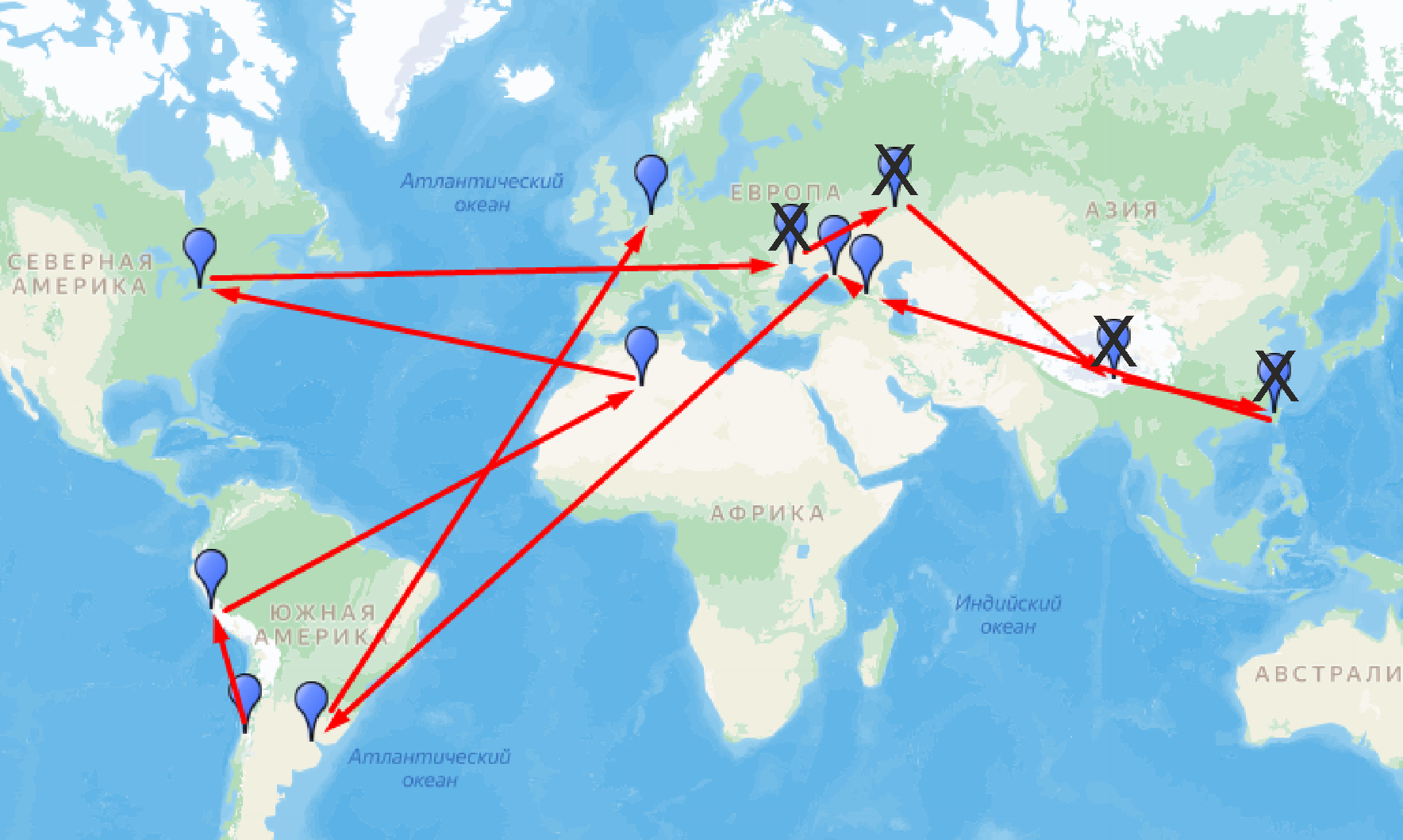 Это маршрут передвижения из одной песни. Подсказка №2 для всех (5 минут) Деду морозу еще в Чили и в Перу, в Алжир... Подсказка №3 для всех (7 минут 30 секунд) А вот эти пункты исключены: Тайвань Одесса Самара Тибет Подсказка №4 для всех (8 минут 30 секунд) ....... ..... ......., можно даже без тоста.